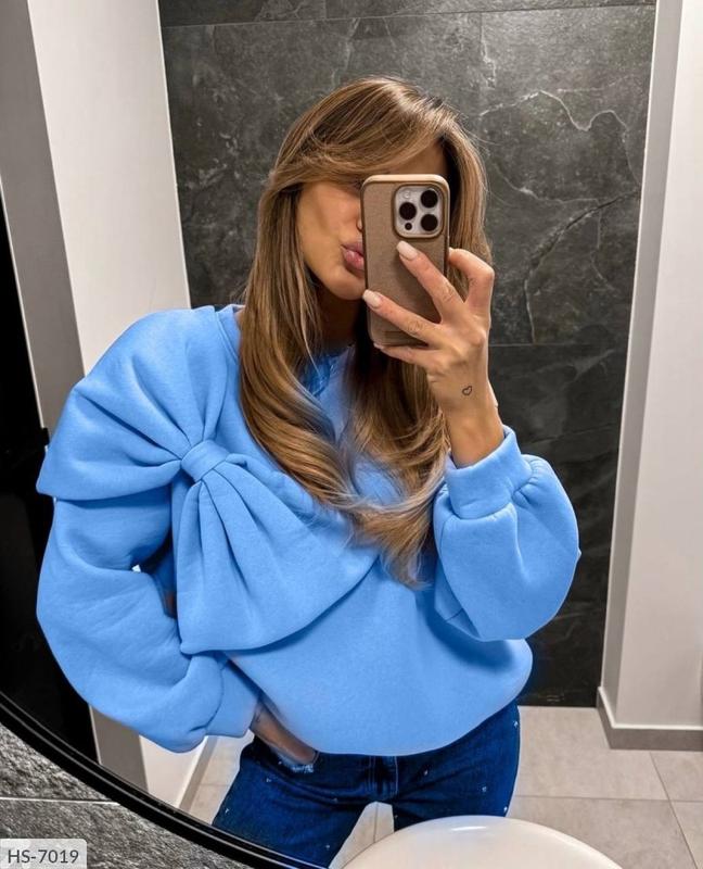 Світшот HS-7021 Розміри: 42-46 Светри, кофти Тканина трикотаж теплий трехнить Кольори: молоко, беж, чорний, червоний, блакитний Стильний трендовий светр з декоративним бантом спереду Крій оверсайз Низ і рукава на манжетах