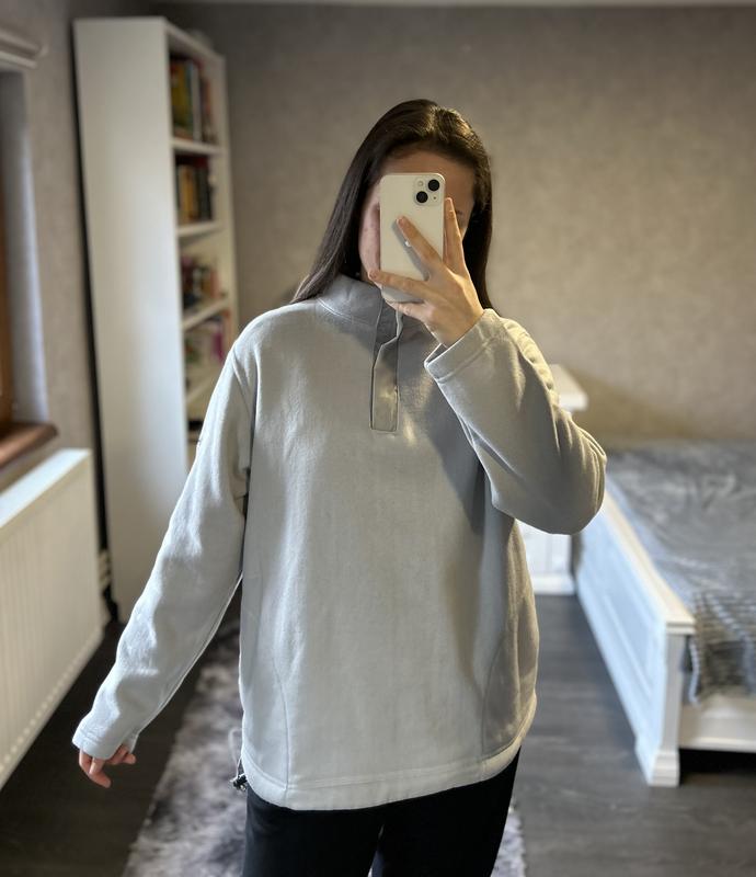 Світшот на флісі Размер указанный L, классно сядет и на меньший как оверсайз Очень приятный к телу Цвет серый Есть два кармана Снизу можно стягивать и регулировать длину Стан - идеальный 65% полиакрил 35% бавовна Одет на рост 164 см, размер S