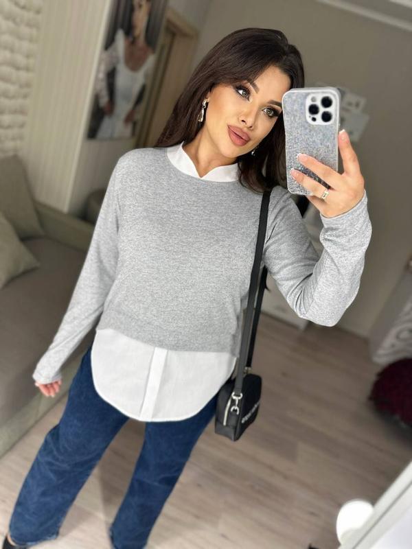 Модная кофточка-обманка, с имитацией блузки. Материал очень приятный на ощупь. Без застежек. Мод.232 Размеры : 48-52,54-58 Цвет : графит, меланж (серый) Тканина : Ангора Замеры в не растянутом виде, тянется + 8-10 см 48-52 Ог 116 см Длина рукава 74 Длина 73 см 54-58 Ог 130 см Длина рукава 75 см Длина 73 см