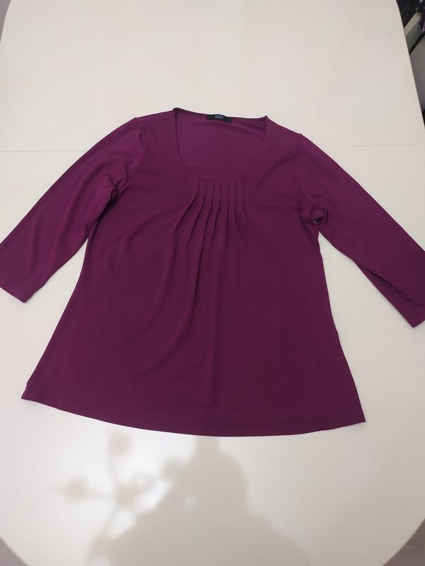 Идеальное состояние.Легушка кофта, приятная к телу, тянется красиво. Фиолетово- бордовый, красивый цвет. Написано, что размер 12. А по замерам в спокойном разложенном виде: плечи 37 см, от подмышки до подмышки полуобхват 46 см, в самом низу полуобхват 56 см. Рукав от плеча имеет 41 см.Загающая длина 60 см. Глубина выреза 12 см