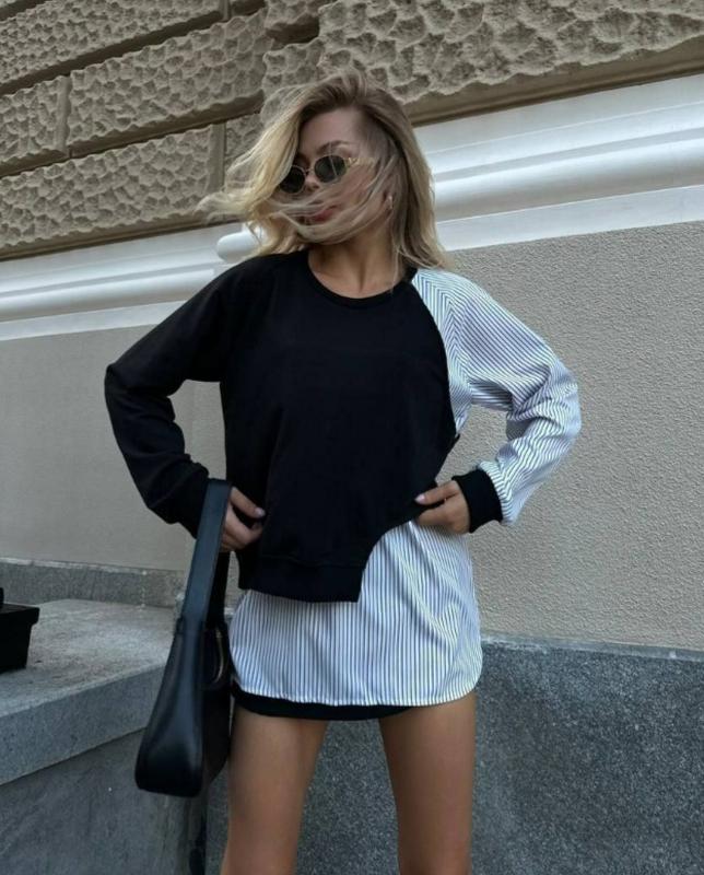 Асимметричный свитшот в сочетании с коттоновой рубашкой Цена 755 грн Тканина: основа -трикотаж двунить, сорочка - коттон Размеры: 42-46; 48-52 Свитшот отличного качества, цвета: черный и серый, полоска т. синяя. Все обрабатывающие элементы (горловина, манжеты рукав и низ кофты обработаны -кашерс) #свитшот #женский свитшот #рубашкаженская #женская одежда #женская-дежда #свитшот #рубашкаженская_family_shop3