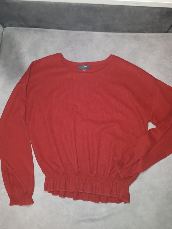 Свiтшот Primark р. S/M у дуже гарному станi. Колiр бордо, темнiший, нiж на фото( камера не зовсiм передала), бiльше схожий, як на фото 5,6. Тканина тягнеться, як трикотаж тонкий жатий. Зовсiм не мнеться. Замiри: довжина по спинцi до резинки - 50 см, рюша - 6 см. Довжина рукава вiд горловини до самого краю з рюшою - 76 см, довжина вiд плеча до рюшi - 50 см, ширина у грудях - 56 см, ширина в талii (коли резинка нерозтягнута)- 35 см, тягнеться до 55 см.