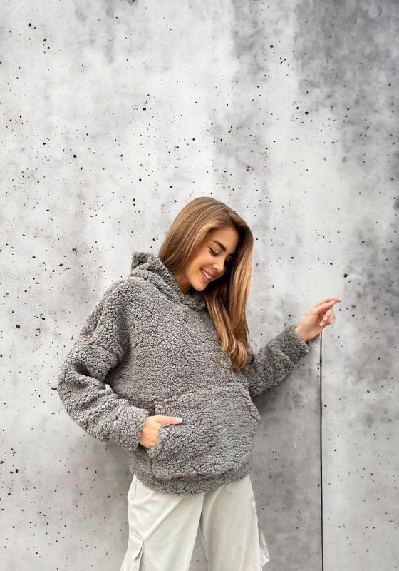 Женская кофта оверсайз серого цвета Материал: объёмный мех барашек Замеры: Размер S (42-44) Грудь: 124см Длина: 70 см Длина рукава: 72см Размер M (46-48) Грудь: 130см Длина: 72 см Длина рукава: 72 см