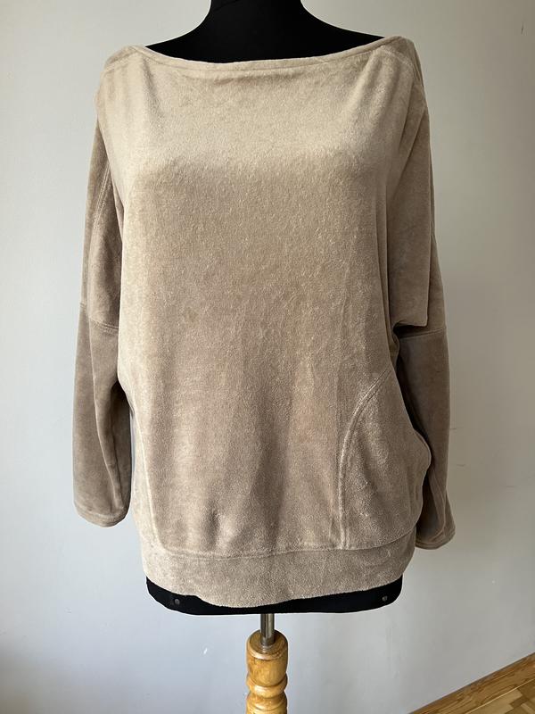 Світшот бренду Plush&Lush велюровий в гарному стані. З боків є кишені, рукав цільнокрійний. Розмір S-M. Заміри: арг- вільно, пос-47 см, довжина рукава від горловини-61 см, довжина по спині-57,5 см. В складі тканини- 75% бавовни. Колір бежевий.