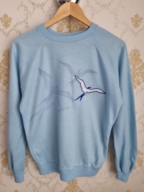Свитшот нежно голубого цвета. Все бирки срезаны. Ткань по ощущению полиэстер Замеры общая длина от плеча спереди 61, рукав реглан тому меряю от шеи 72/45, пог 54 Подойдет на S, не большая М