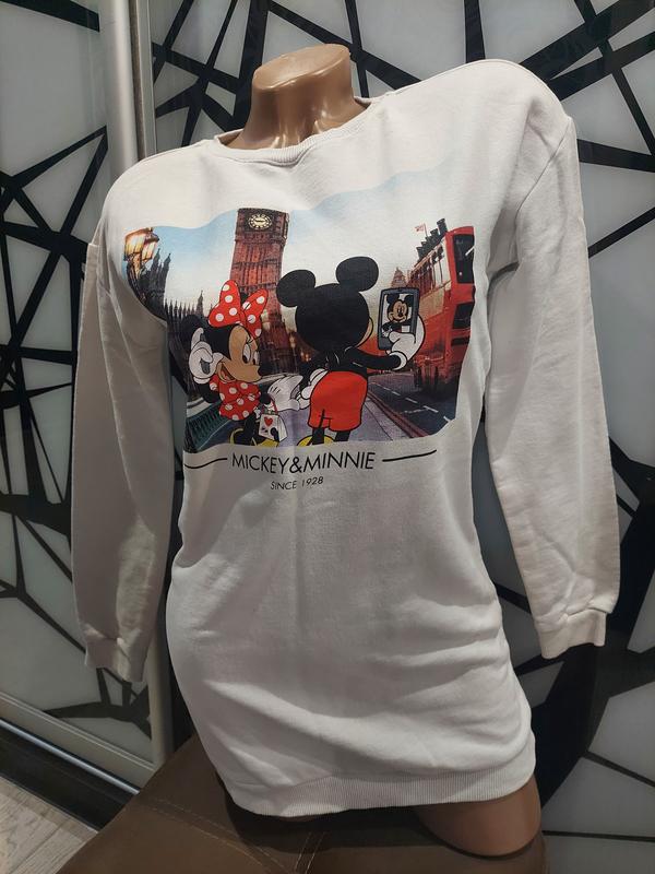 Крутой свитшот Mickey Mouse от Disney белый в оличном состоянии. Есть малюсенькая зацепка и совсем малозаметное небольшое пятнышко у горловины. В носке нюансы не виднт. На бирке размер XS, на наш 42-44. Замеры по запросу. Состав ткани 73% коттон, 27% поликюестер.