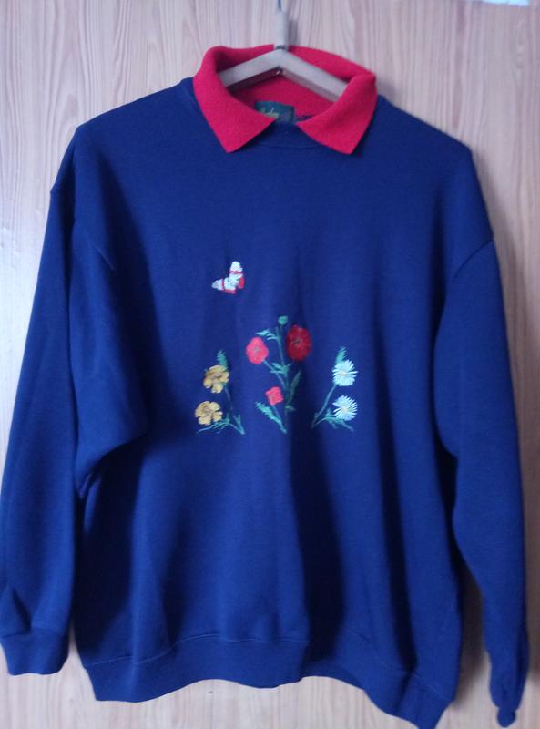 Свитшот красивого синего цвета, с красным воротничком и вышивкой. Рукав - 50 см, НОГ - 60 см, довжина - 63 см.