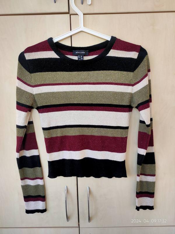 Свитер люрекс укороченный р-р М (10 англ.). Замеры: полуобхват груди - 36, полуобхват талии - 32, длина 45, рукав 59. Состояние отличное, без дефектов.