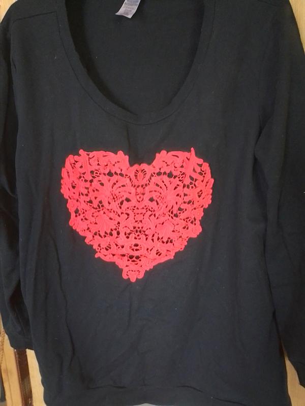 Хебешный свитшот с аппликацией-Сердце из красного кружева, пришито. Пог-70, Пот-68, Длина -70, длина, рукав-60, пройма-31,полуокр, низ-74, изнанка как тонкая байка