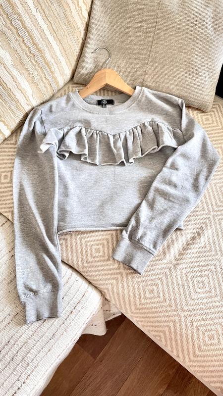 Серая кофточка с рюшей в области груди, что придает изделию нежность. Свободного кроя, не в облипку. Ширина 48, рукав 57 см, длина 45 см