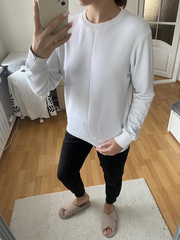 Світшот, білого кольору, розмір с, від українського бренду. На фото видно деякі дефекти, на горловині немає ніякий жовтих плям, лише всередині трішки, і один маленький дефект на рукаві, сам виріб ідеально чистий і білий, через дефекти ціна трішки нижча, але їх не видно коли носиш, цей світшот гарно доповнює різні образи.