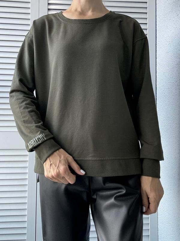 Стокова річ Оригінальний світшот від Victoria Sport в шикарному кольорі хакі. На спинці оригінальний, сексуальний виріз. Тоненький фліс На рукаві лого бренду По спинці йде довший Розмір оверсайз ПОГ 58 см довжина 60-65 см Гарно буде під лосини