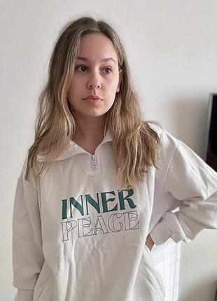Белый свитшот с надписью и зип горлом, с легким утеплением. Имеет следы использования.