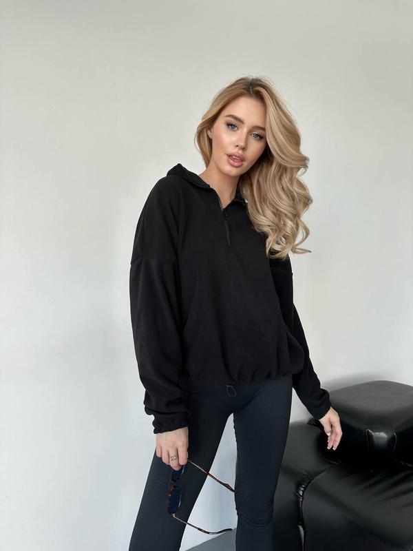 Світшот виконаний з мʼякої та теплої флісової тканини, що забезпечує комфорт у прохолодну погоду. Має стильний дизайн із затяжками внизу, які дозволяють регулювати посадку за бажанням. Доступні розміри: • 42-46 Кольори: • Чорний • Беж Цей світшот є ідеальним вибором для створення ручного та модного образу в повсякденному стилі.