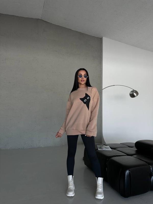 Фото реал 📸 Свитшот «Киса» Модель :373 Тканина : трьох нитка Размер : 42-46,48-52 Цвет: беж новая Цена: 595 гр Заміри 42-46/48-52 Длина по спинке 70/70 см ОГ до 100/до 115 см Длина рукава (спущенный) 51 см Плече (спущене) 24 см Параметры модели на фото, рост 168 см ОГ - 91 см ОТ - 69 см ОС - 91 см код20-1955(ТЯц)