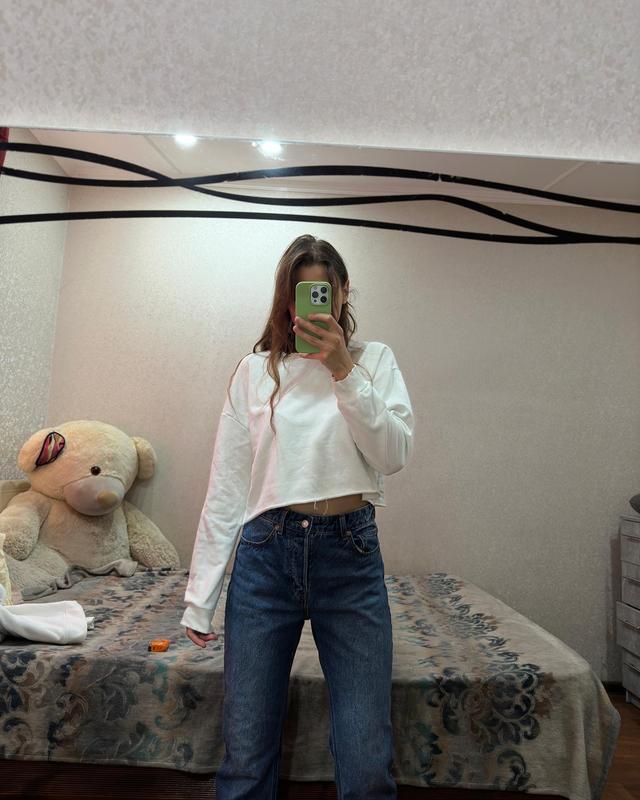 Укороченный оверс свитшот🖤 Не на флисе, плотный коттон, низ необработанный Размер от хс до Л Состояние идеал, пятно на рукаве, последнее фото, выводить не пробовала