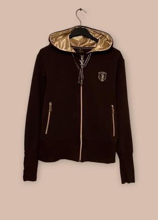 Кофта з капюшоном в стилі LV. Яскравий коричневий колір. - Вільний крій, який забезпечує повну свободу руху. - Капюшон на шнурках забезпечує додаткове тепло. - Довгий рукав. - Дві бічні кишені на блискавці. - Зручна застібка-блискавка. - Спереду та на спинці логотип . Розмір М: - Довжина рукава : 57cm. - Довжина: 53 cm. - Плечі: 42 cm. - Ширина під пахвами: 44 cm. Склад: 75% Cotton, 20% Polyester, 5% Lycra Хороший стан