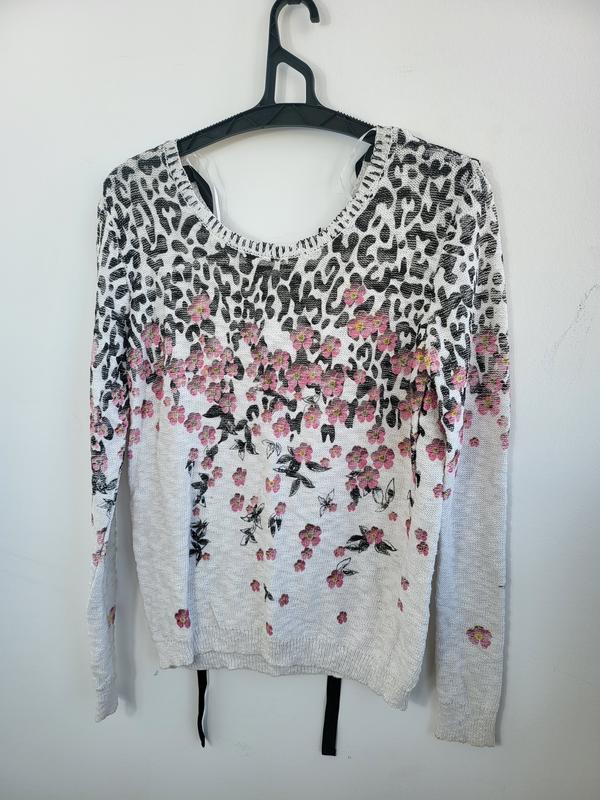 Кофта Serianno Красивая интересная кофта, сзади лента. Она легкая из хлопка, но и не летняя. Принт нанесений зверху на Вязаний виріб. Плечи 44 примерно, так как регулируется лентой. Грудь 49 Длина 64