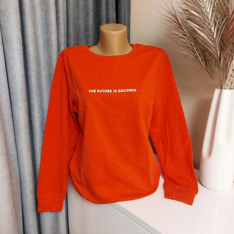 Свитшот, размер М. Цвет красно-коралловый. Ширина 50 см, длина 63 см, плечи 39 см, рукав 60 см. состав 70% хлопок