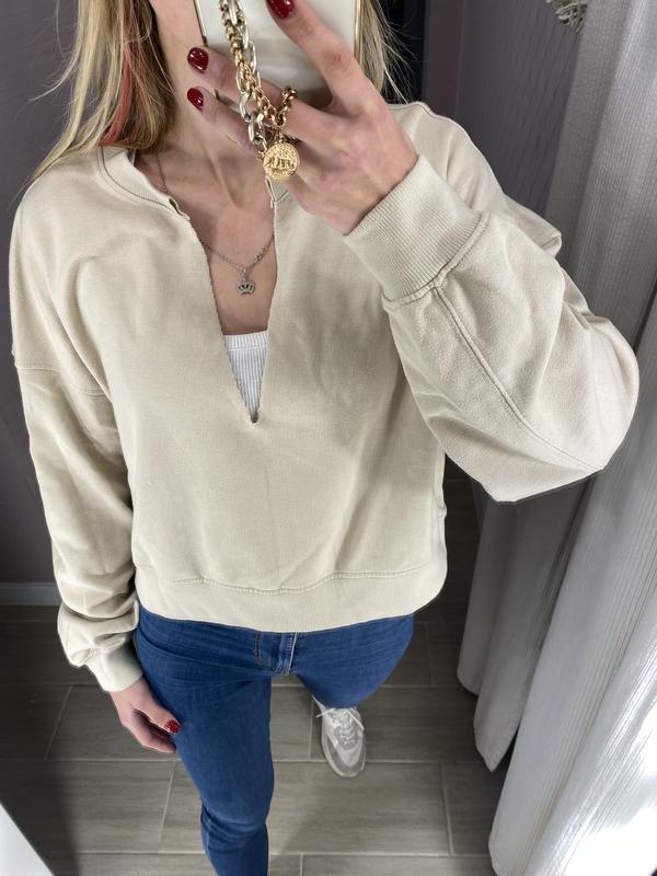 Стильний світшот , бежевого кольору, має глибом виріз. Розмір С , стан гарний.