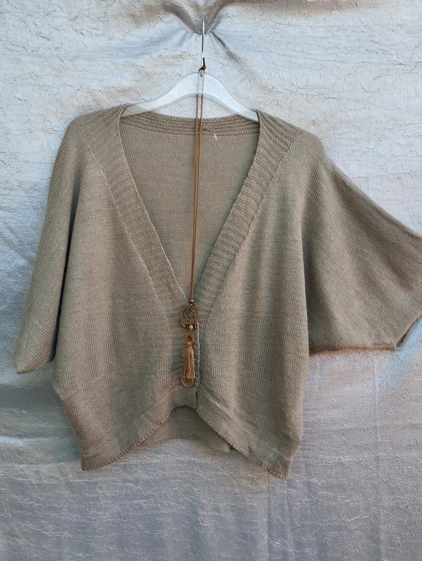 Рукава цельнокорийская.Вязкая машинная,трикотаж.Зместь трикотажа : акрил, мохер, шерсть, полиэстр. Цвет - темный беж,болото. П.о.г.- 74 ширина плечей - 107 пол о низ - 53 длина - 56