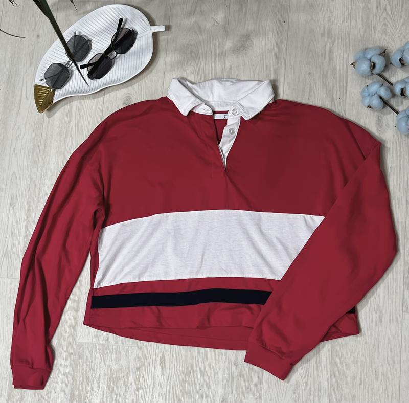 Вкорочена кофта з коміром червоного кольору. В житті колір більш червоно-малиновий.