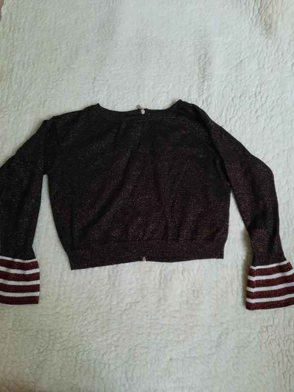 Продам топ-свитшот, очень красивом состоянии. Нюансов нет.Цвет-черный с золотой металлической нитью. Рукав полуспущен,довгий Застібается на змейку. Ширина плеч 44, длина рукава 60, пог50, длина 42 см
