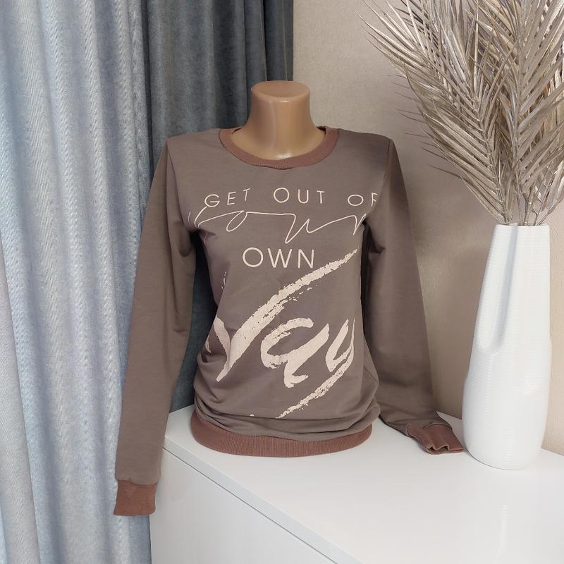 Свитшот. Цвет какао. Размер S. Ширина 42 см, длина 65 см, рукав 62 см. Низ, горловины и рукава на манжете резинка. Двухнитка.