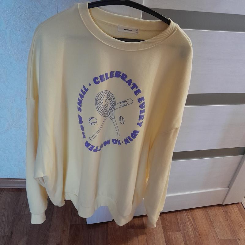 сетшот нежно желтого цвета, оверсайз, стильный, приятный к телу,размер указан М, подойдет и на L.
