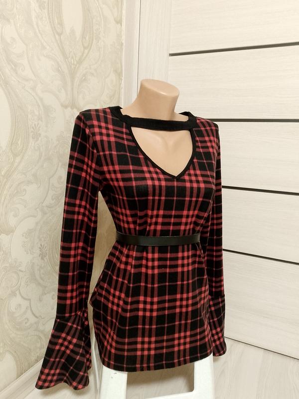 Кофта джемпер в клетку рукава с рюшами v вырез с поясом под шею
