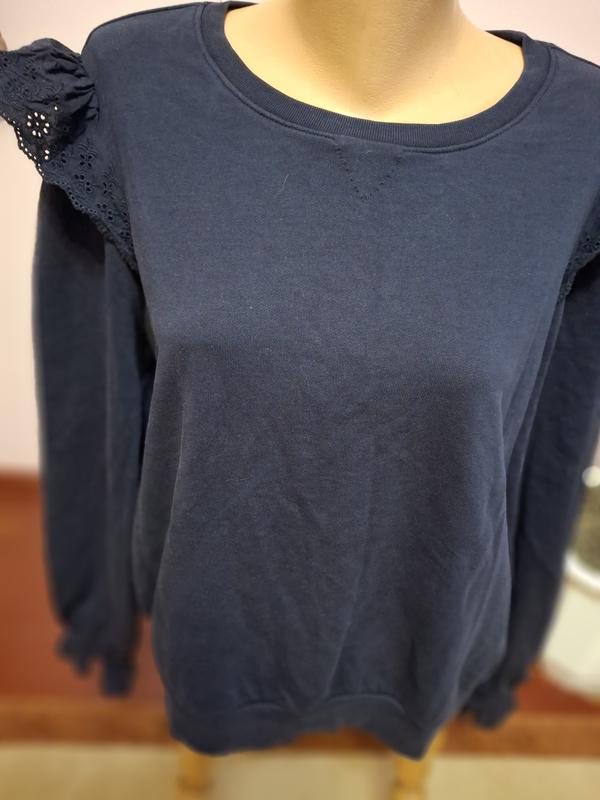 світшот темно-синій, на плечах і на рукаві є прошва, низ і рукава на манжеті, якщо прошва заважає ії можна легко відрізати і буде звичайний світшот. Пог-60, довжина по спині 59, довжина рукава 68, плюс прошва ще 5 см.
