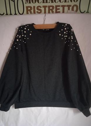 Очень красивая кофточка из трехкожное ткани меланжевого цвета черно серого с пышными рукавами декорированы разновыраженными жемчужинами.