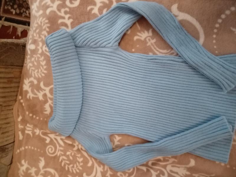 новый хорошенький свитерик,ворот хомут, по желанию можно выкладывать в нескольких вариантах,цвет нежноголубой,камера так не передает