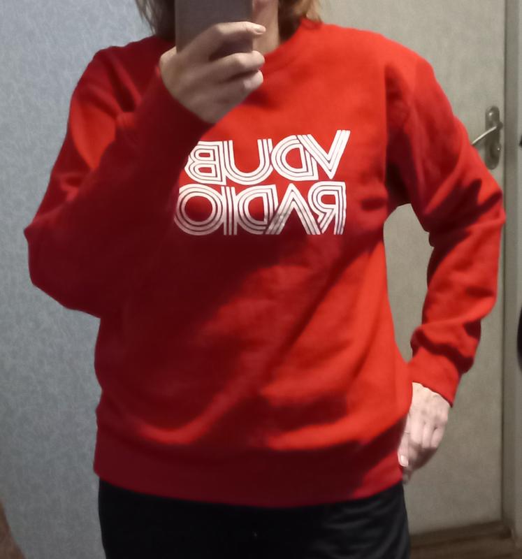 Красный свитшот. Размер М. Состав: 80% коттон, 20% полиэстер. Плотный трикотаж на флисе. Красивый насыщенный красный цвет. Надпись на груди VDUB RADIO. Свитшот будет хорошо смотреться на девушке и на парне, современная модель. Замеры: ширина в плечах-47 см, ширина в груди, талии -54 см, длина-66 см, длина рукава-61 см. На фото надето на размер М.