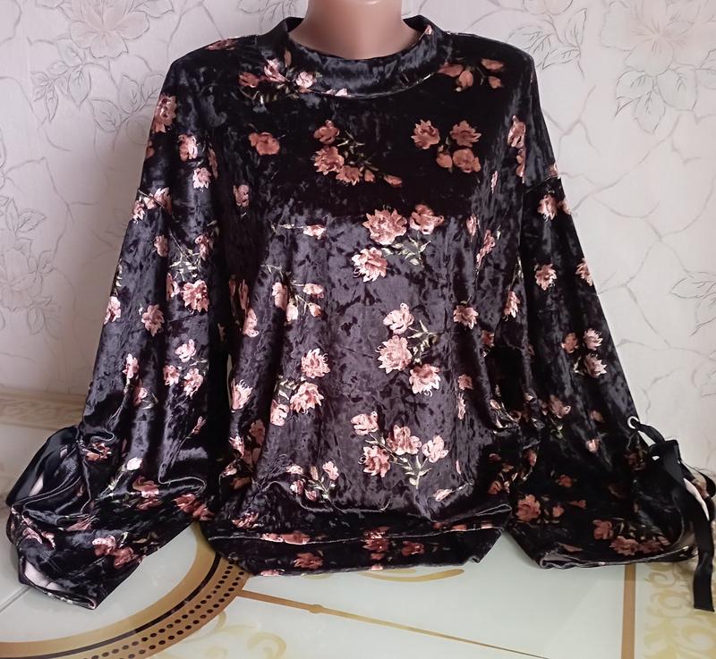Фирменный бархатный свитшот с широкими рукавами на завязках, с цветочным принтом, плечи спущенные-свободно, ПІГ 56-60, ПИТ 52-57, рукав от горловины 75 регулируется завязками, длина изделия 66. Состояние новой вещи.
