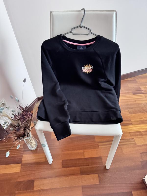 Світшот Scotch & Soda, чорного кольору, дуже приємна тканина, натуральний склад: котон, модал. Без фліса, але не тонкий.Стан ідеальний, трохи відстає наліпка під вишивкою. Розмір М. Довжина- 62 см. ПОГ - 48 см.