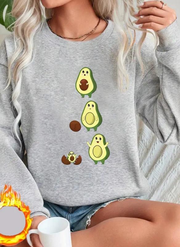 Женский Свитшот с Флисовой подкладкой и Принтом в облике Авокадо - Повседневный с Круглым Вырезом и Длинными Рукавами. Размер немного маломерит