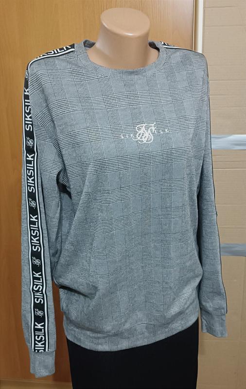 Серый свитшот в клетчатый принт с лампасами на рукавах.