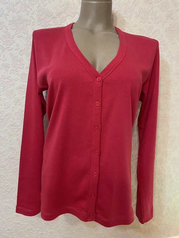 Малиново-красного цвета трикотажная кофта на пуговицах. Не одягалась. В идеальном состоянии. Длина 63 см Длина рукава 61 см ПОГ 48 см Полу Объем низа кофты 50 см