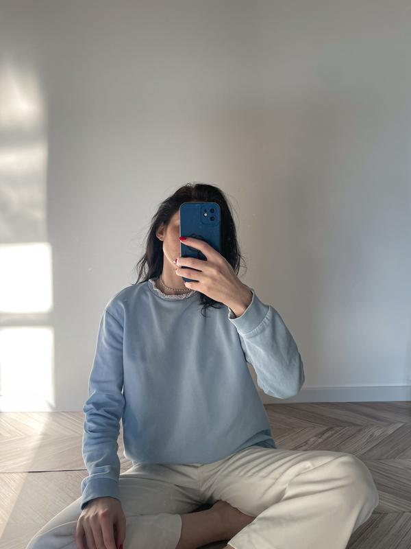 Милий блакитний світшот від TU Горловина прикрашена мереживом Тепленький з флісом всередині В складі 91% бавовни Розмір на бірці UK14 (M) Плечі 49 Довжина 63 ПОГ 59 Довжина рукава 60