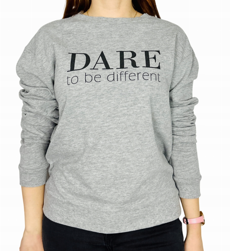 Серый свитшот с прикольной надписью Dare to be different. Удобная, натуральная ткань, приятный к телу. полуобхват грудь 56 полу охват талия 52 полуобхват по низу 49-резинка длина 57