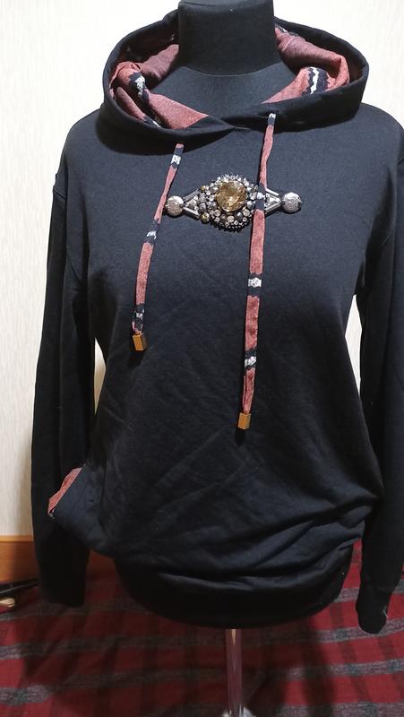 В состоянии нового, оригинальный, приятный на ощупь, свитшот. Низ рукавов и свитшота на вязаных манжетах. Капюшон и боковые карманы изнутри на яркой, шифоновой подкладке. Район горловины украшен роскошной брожкой. Выглядит невероятно. Замеры: длина по спинке -67см, длина рукава -61см, пог-50см, к низу прямой.