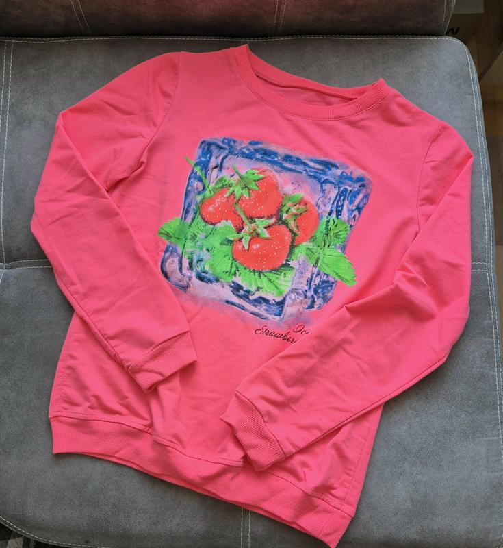Яркий и легкий свитшот, неоновая кофта с клубникой в хорошем состоянии, рассеиватель хс-с. Без пятен и повреждений. длина по спинке 58 см, ширина под рукавами 47 см, рукав 59 см.