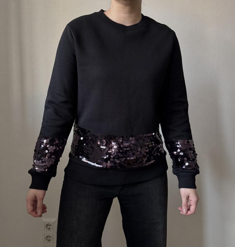 Свитшот черного цвета, на флисе Размер М В составе 65% катон Длина 63 см, длина рукава 63 см, полуобхват груди 52 см Состояние нового, но без бумажной бирки Одето на размер Л, рост 167