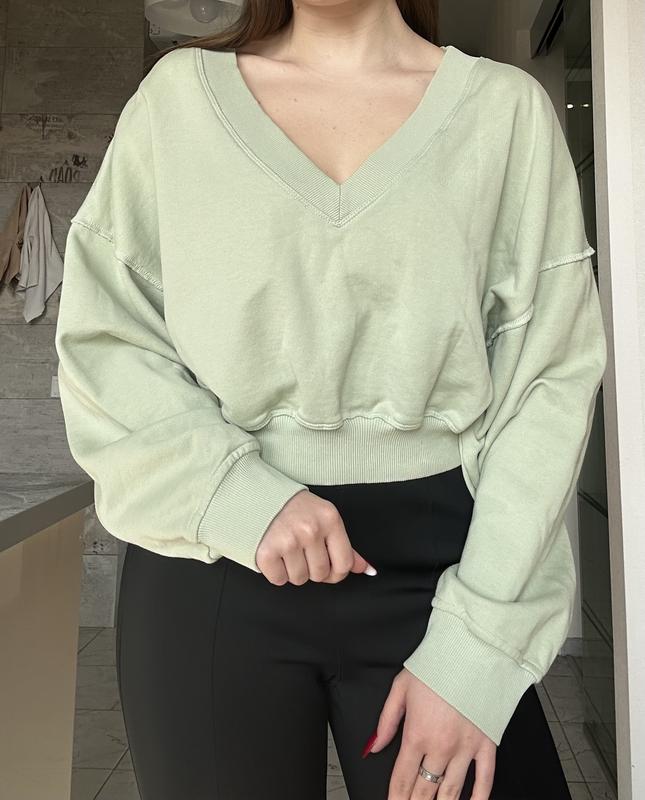 Класна кофта з v вирізом. Дуже приємний та ніжний колір. Можна носити як звичайно, так і спустити одне плече, або одразу два Довжина - 46 см Рукав (від вирізу) - 67 см Пів обхват резинки знизу - 33 см