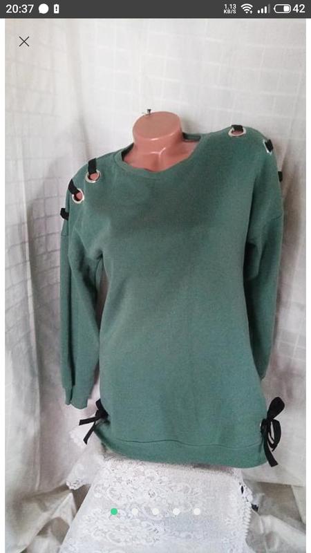 Свитшот утепленный, с оригинальным декором Плечи 66 см, спущенное плечо ПОГ 51-66 см ПОТ 48-53 см ПОБ 51-57 см Рукав 51 см от плеча, 70 см от горловины Длина 70 см Есть кашлатка Отправка Укрпоштой