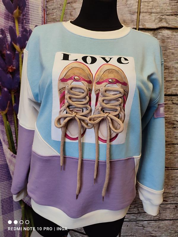 свитшот выполнен из качественной турецкой 3-х нитки петля в едином экземпляре и без повторений. Размер м-л, идеально сядет на груди до 100-102 см.ширина свитшота 55 см(по кругу 110 см)