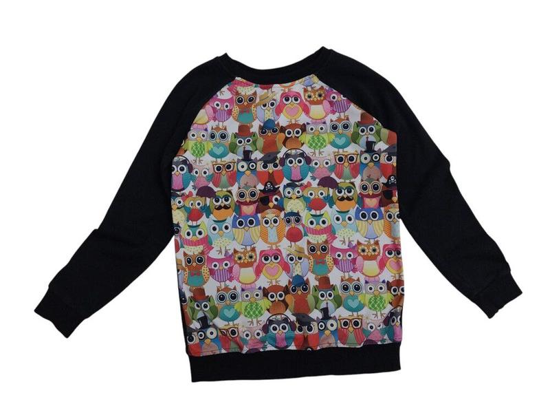 Для прихильниць сов 🦉 женский реглан свитшот, р. 44, S, смотрите замеры. Можно подлетку. Плотный трикотаж, хлопок; часть с рисунком - полиэстер. Основной цвет черный. Замеры, см: длина рукава от горловины 61, по внутреннему шву 46, ширина под рукавами 46, длина спереди по центру 55,5.