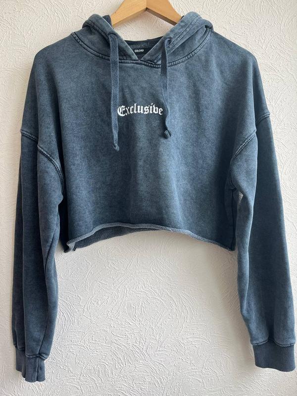 Жіночій кроп-топ, худі бренду CROPP з капюшоном. Капюшон має подвійну тканину, Рукав з манжетом. Колір темно-сірий. Розмір М. Заміри: высота 44 см. Довжина рукава з плечем 76 см. ПОГ 64 см. Склад тканини: 65% cotton, 35% polyester.