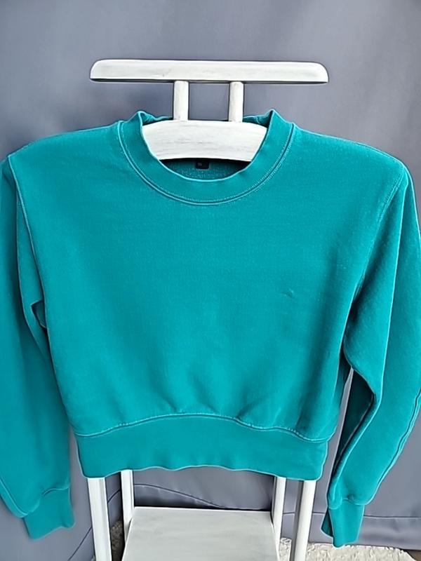 Цвет не передай камера, более насыщенный, бирюза! К телу мягенький, как плюш.На бирке xs, пойдет на s! Оверной. пог 52см, резинка-39см, рукав-60см, не прямой,дугой. плечи-46см, длина по спинке-47см.